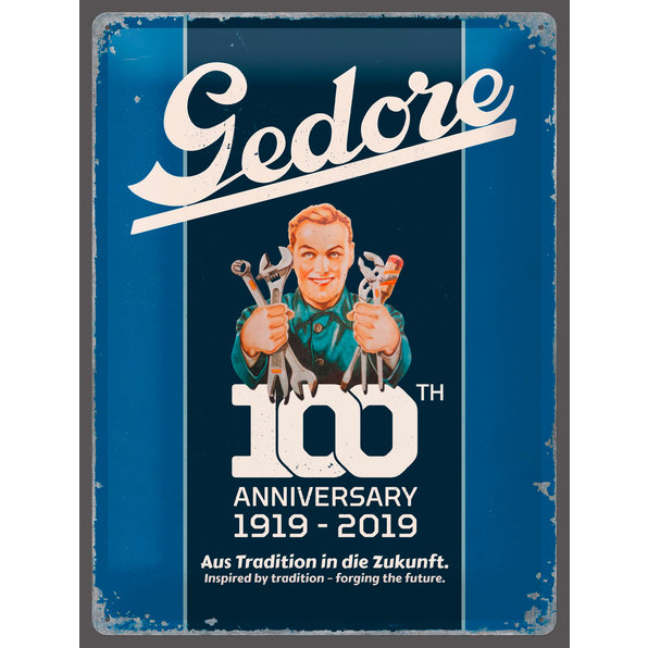 Dit past prima bij de honderdste verjaardag van de hoogwaardige gereedschapsfabrikant Gedore: het nostalgische metalen wandbord "Gedore 100th". Ziet er fraai uit aan de muur van je garage of werkplaats. Echt retro!